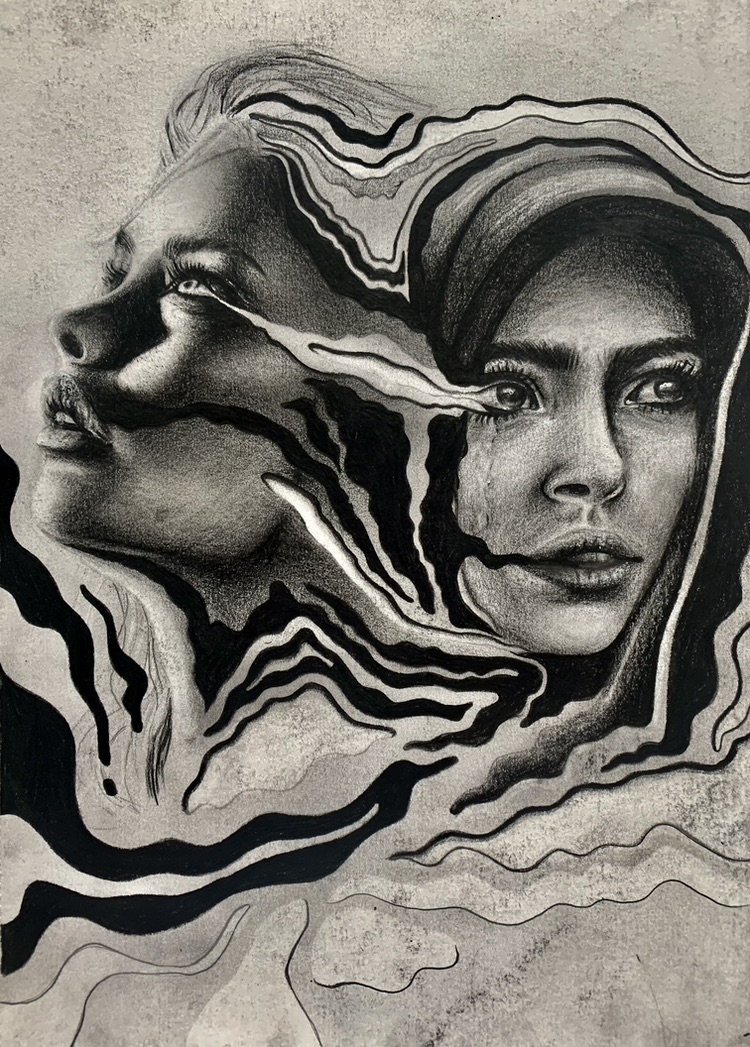 This unfolds as a poignant collection of charcoal pieces, where the stark realities of education meet the shadows of societal challenges, portraying a deep, reflective exploration of technology’s complex impact.